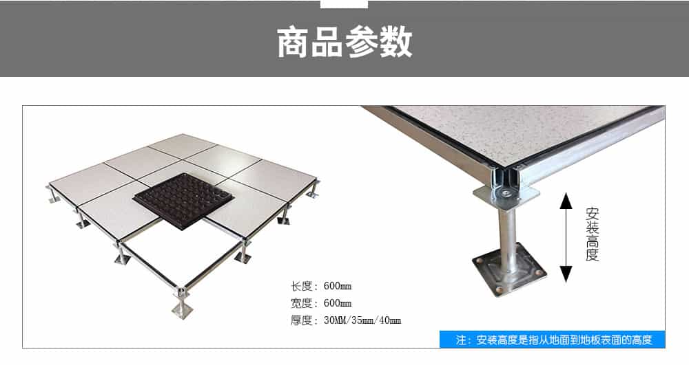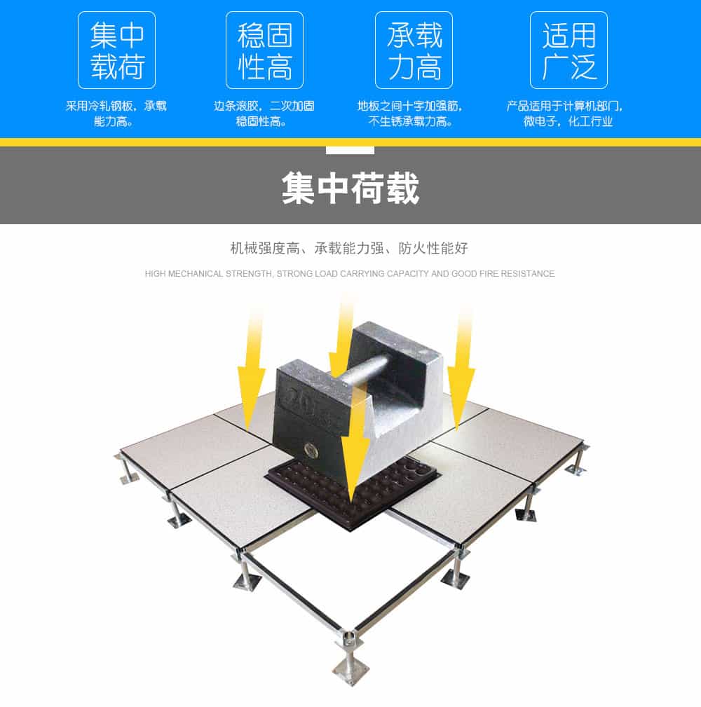 全鋼防靜電地板為全鋼組件,分有邊、無邊、微邊(三種邊處理方式)。底面采用SPCC深沖冷軋板拉伸成型鋼板厚度(0.4~1.5mm),球窩狀結構,增加地板的機械荷載強度。面板采用硬質SPCC鋼板(0.5~2.0mm),上下經過點焊焊接成型,切邊沖孔后,經防銹處理,環氧樹脂粉末靜電噴涂后,中間填充發泡水泥(可以根據客戶需求發泡不同重量),再經過日曬養護后形成穩定的承載結構。地板上表層粘貼防火板(HPL)/復合PVC/ 通體PVC/陶瓷地磚等不同材質的裝飾表層,達到產品花色的多樣性、可以根據客戶需求個性化定制產品。搭配聯網支架、支架、螺釘組裝后,定位聯接更加準確、精度可靠。